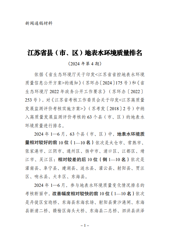 2024年1—6月江蘇省縣(市、區(qū))地表水環(huán)境質(zhì)量排名
